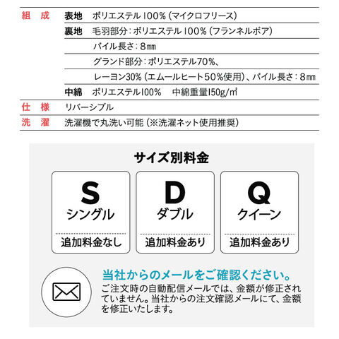 | 組成 | ■表地 ポリエステル100%(280g/m² ロングパイルフランネル8mm) ■グランド部分 ポリエステル50%、レーヨン50%(エムールヒートプラス使用) ■中綿 ポリエステル100% ■中綿 ポリエステル100%(中綿重量150g/m²) |