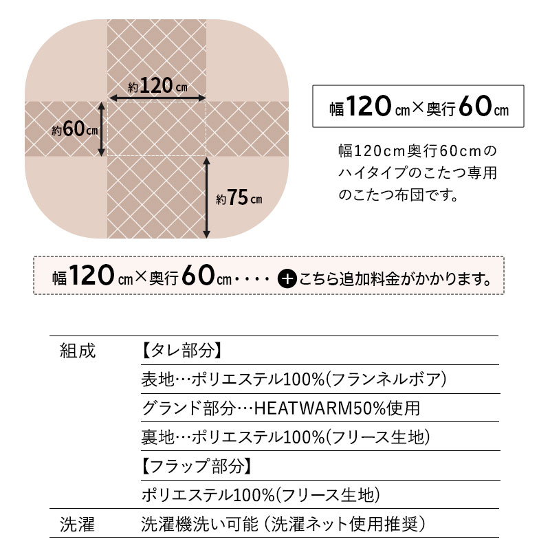 <幅80cm> 全体:約幅230×奥行200cm 天板部分:約幅80×奥行50cm 四隅タレ部分:長さ(一辺)約75cm ※幅80cm×奥行50cmのハイタイプこたつテーブル専用のこたつ布団です。 <幅120cm> 全体:約幅270×奥行210cm 天板部分:約幅120×奥行60cm 四隅タレ部分:長さ(一辺)約75cm ※幅120cm×奥行60cmのハイタイプこたつテーブル専用のこたつ布団です。 |