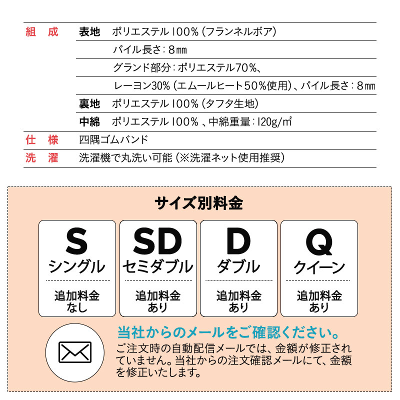 | 組成 | ■表地 ポリエステル100%(フランネルボア) ■裏地 グランド部分:ポリエステル70%、レーヨン30%(エムールヒート50%使用) ※パイルの長さ:8mm ■裏面 ポリエステル100%(タフタ生地) ■中綿 ポリエステル100%(中綿重量120g/m²) |