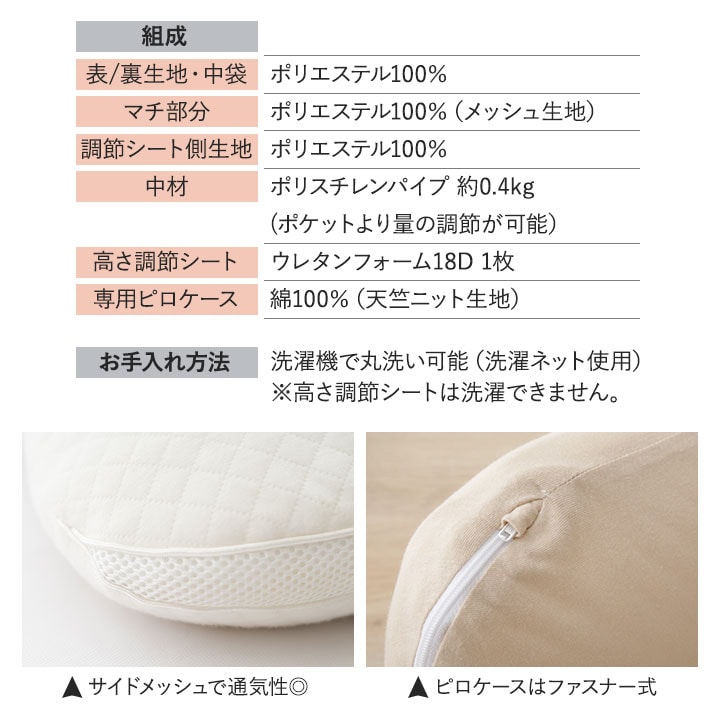 | 素材 | 表/裏生地・中袋:ポリエステル100% マチ部分:ポリエステル100%(メッシュ生地) 調節シート側生地:ポリエステル100% 中材:ポリスチレンパイプ 約0.4kg(※ポケットより量の調節が可能) 高さ調節シート:ウレタンフォーム18D 1枚 専用ピロケース:綿100%(天竺ニット生地) |