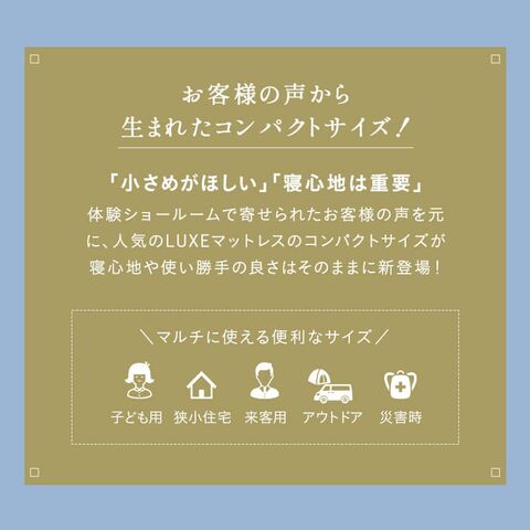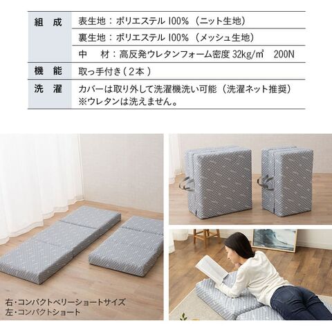| サイズ | ■コンパクトベリーショート 約幅65×奥行120×厚さ11cm (折りたたみ時:約幅65×奥行40×高さ33cm) 重量:約3kg ■コンパクトショート 約幅65×奥行180×厚さ11cm (折りたたみ時:約幅65×奥行60×高さ33cm) 重量:約5kg ■セミシングルショート 約幅80×奥行180×厚さ11cm (折りたたみ時:約幅80×奥行60×高さ33cm) 重量:約5.7kg |