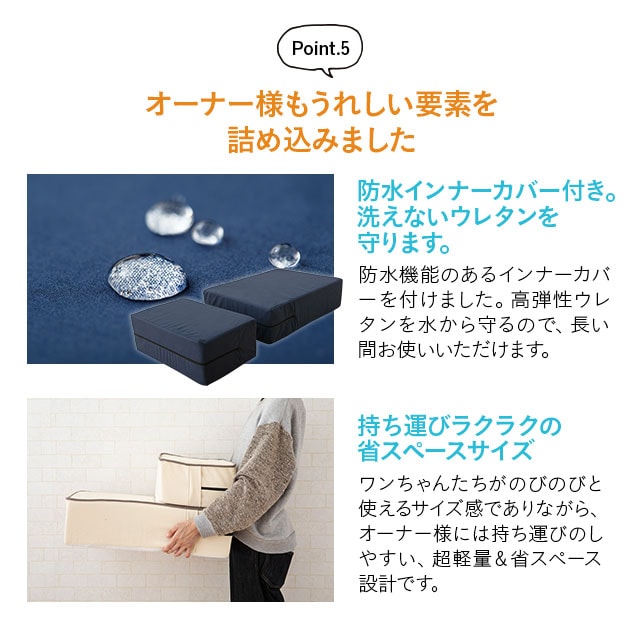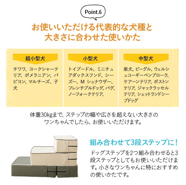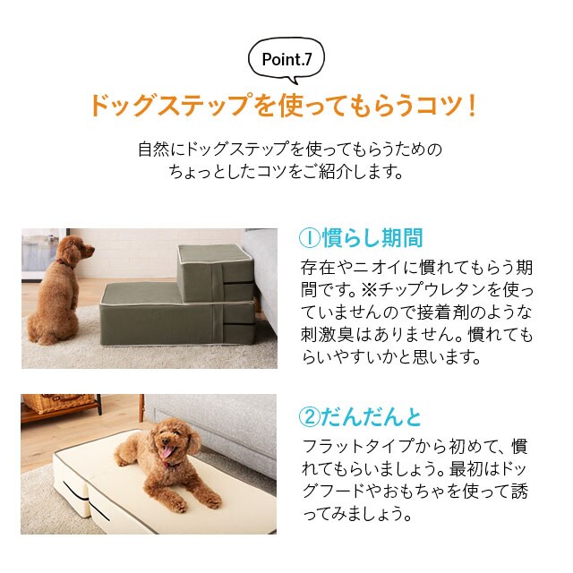 | 使い方のコツ | 自然にドッグステップを使ってもらうためのちょっとしたコツをご紹介します。 ①慣らし期間 存在や臭いに慣れてもらう期間です。 ※チップウレタンを使っていませんので、粘着剤のような刺激臭はありません。 ②だんだんと フラットタイプでまずは存在に慣れてもらいましょう。 最初はドッグフードやおもちゃを使って。 ③意識させない ソファやベッド越しにご家族を呼んでみましょう。 オーナー様の視線に意識を向けることで、ステップが気にならなくなっていきます。 |