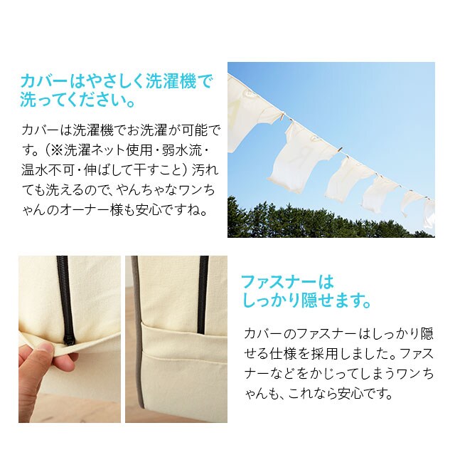 | 洗濯 | ■カバー 取り外して洗濯機洗い可能 (※洗濯ネット使用・弱水流・温水不可・伸ばして干すこと推奨) ■防水インナーカバー 汚れた部分を拭き取ってください。 |