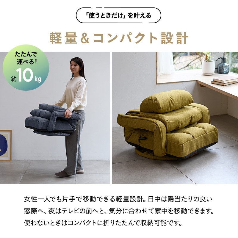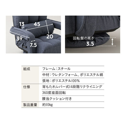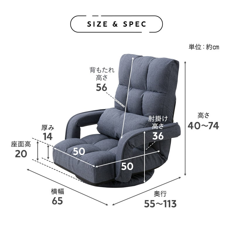 | サイズ | 全体:約幅65×奥行55-113×高さ40-74cm 座面:約幅50×奥行50×高さ20cm 背もたれ:約幅50×長さ56cm 肘掛け:約幅7.5×奥行39×高さ36cm ※計測する位置や角度により、若干の誤差が生じる場合があります。 |