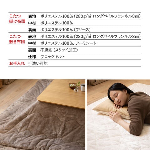 | こたつ掛け布団 | ■表地 ポリエステル100%(280g/m² ロングパイルフランネル8mm エムールヒートプラス使用) ■中材 ポリエステル100% ■裏面 ポリエステル100%(マイクロフリース) |