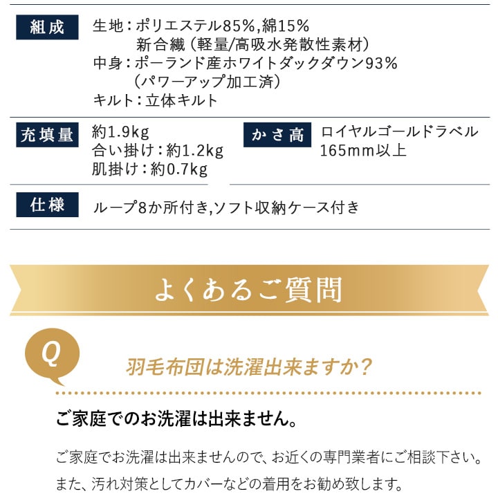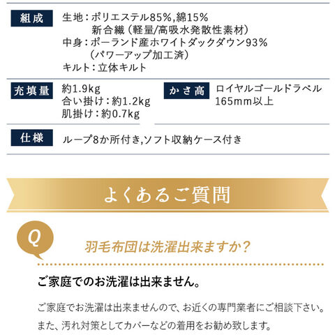 | 品名 | 日本製 ロイヤルゴールドラベル 2枚合わせ羽毛布団 |