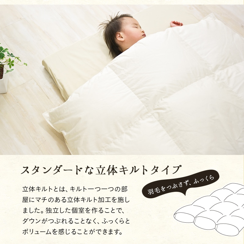 | 組成 | 生地:綿100% 80サテン生地(安心の天然素材) 中身:ハンガリー産ホワイトグースダウン93% (パワーアップ加工済) キルト:立体キルト |