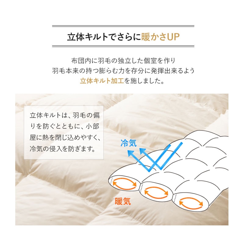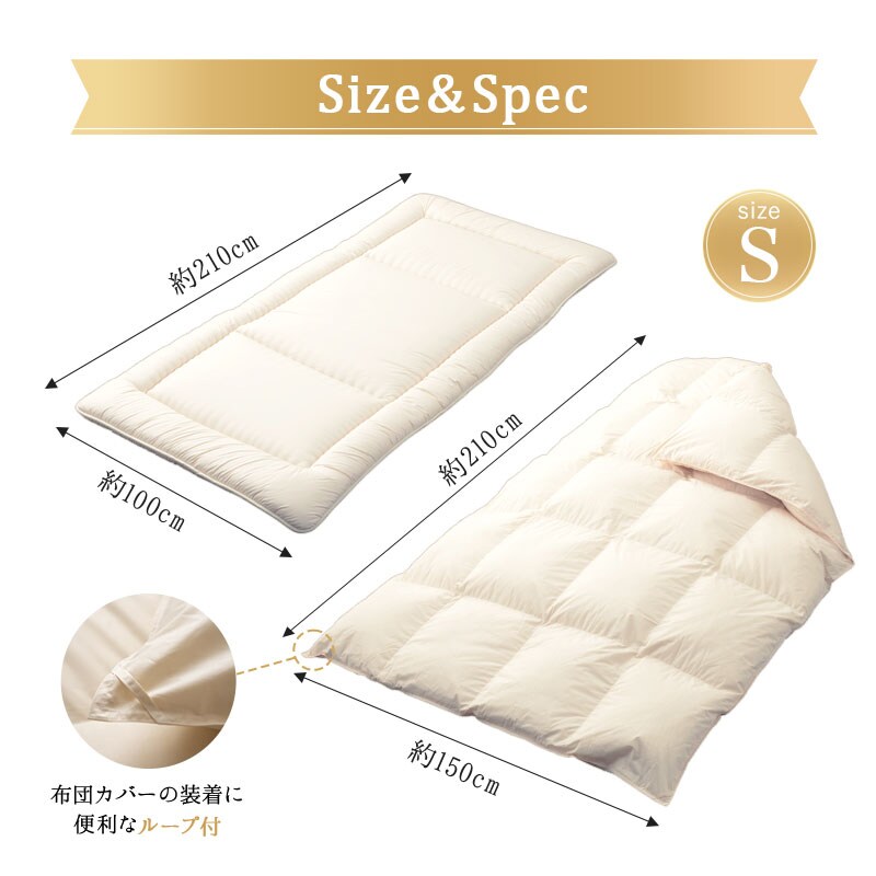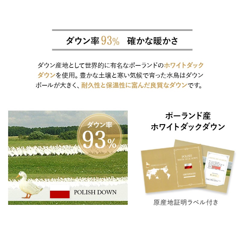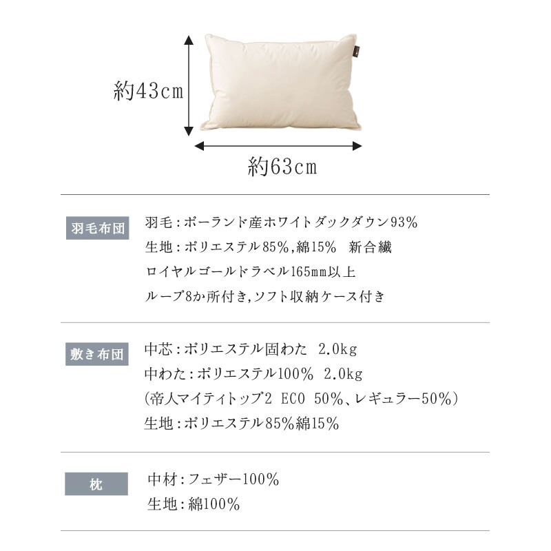 | 羽毛布団 | シングルサイズ:約幅150×奥行210cm 生地:ポリエステル85% 綿15% 新合繊 中身:ポーランド産ホワイトダックダウン93%(パワーアップ加工済) 充填量:約1.0kg かさ高:ロイヤルゴールドラベル165mm以上 ※ループ8か所付き、ソフト収納ケース付き、立体キルト |