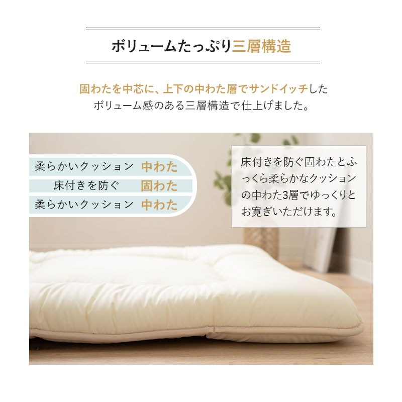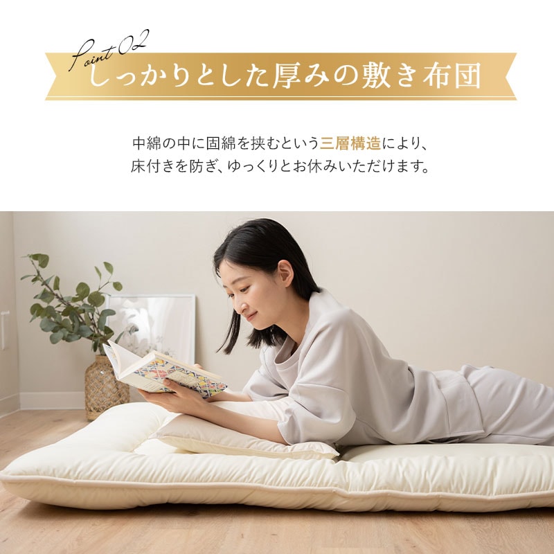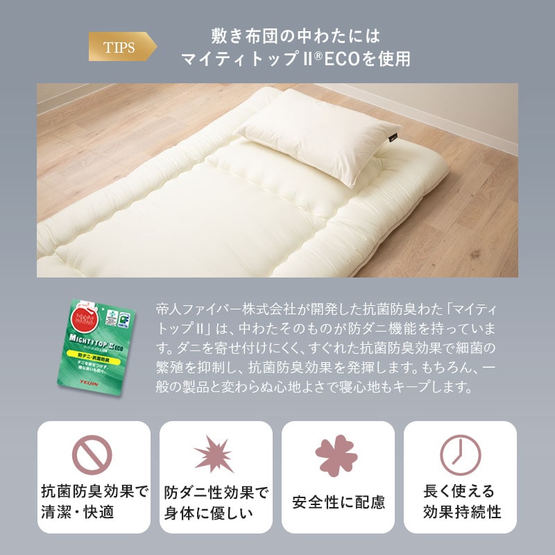 | 敷き布団 | シングルサイズ:約幅100×奥行210cm 中芯:ポリエステル固わた 2.0kg 中わた:ポリエステル100% 2.0kg (帝人マイティトップⅡ®ECO 50%、レギュラー50%) 生地:ポリエステル85% 綿15% |