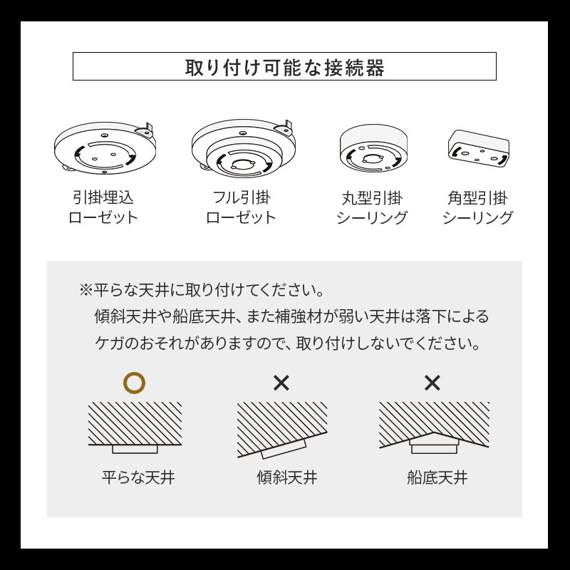 | 注意事項 | ※平らな天井に取り付けてください。 ※商品に付属する説明書をご確認の上、安全に注意して取り付けを行ってください。 ※調光機能がある電源が付いた部屋ではご使用頂けません。予めご了承ください。 |