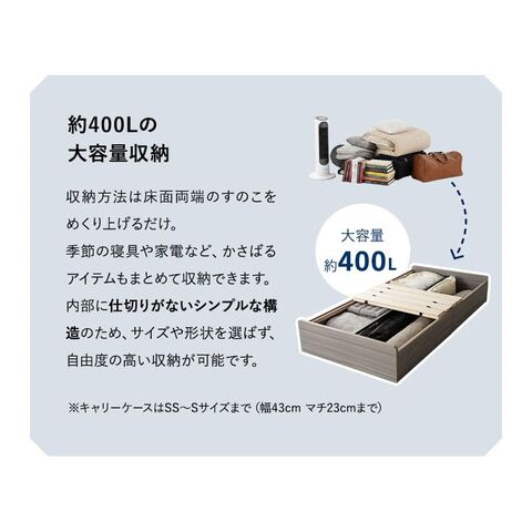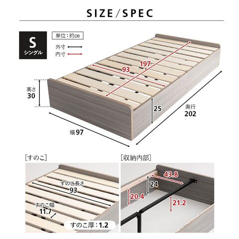 | サイズ | シングルサイズ 全体:約幅97×奥行202×高さ30cm 床面:約幅93×奥行197×高さ25cm 収納(内寸):約幅93×奥行197×深さ20.4cm |