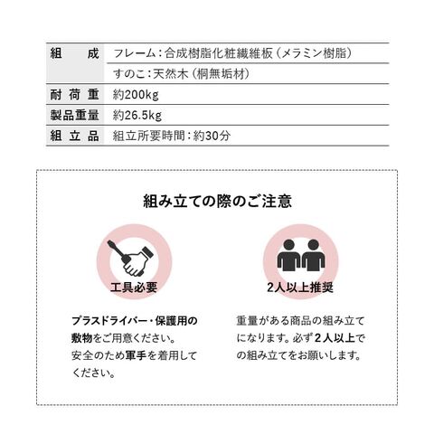 | 組成 | フレーム:合成樹脂化粧繊維板(メラミン樹脂) すのこ:天然木(桐無垢材) |