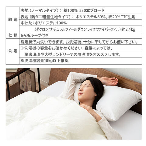 | 組成 | 表地(ノーマルタイプ): 綿100% 230本ブロード 表地(防ダニ軽量生地タイプ): ポリエステル80%、綿20% TTC生地 中わた:ポリエステル100% (ダクロン(R)ナチュラルフィールダウンライクファイバーフィル) 約2.4kg |