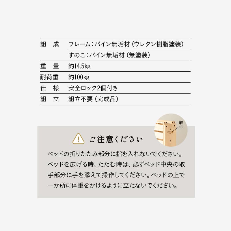 | 組立 | 組立不要(完成品) ※ベッドの折りたたみ部分に指を入れないでください。 ※ベッド開閉時は、必ずベッド中央の持ち手部分に手を添えて操作してください。 ※ベッドの上で一か所に体重をかけるように立たないでください。 |