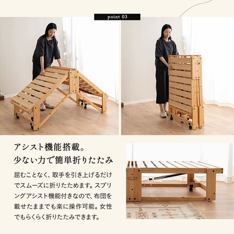 | 折りたたみベッド | ■サイズ 約幅69.5×奥行180×高さ33cm (折りたたみ時:約幅69.5×奥行18.5×高さ108.5cm) ■素材 フレーム:パイン無垢材(ウレタン樹脂塗装) すのこ:パイン無垢材(無塗装) ■カラー ナチュラル ■商品重量 約14.5kg ■耐荷重 約100kg ■仕様 安全ロック2個付き キャスター付き アシスト機能付き 取っ手付き ■組立 組立不要(完成品) ※ベッドの折りたたみ部分に指を入れないでください。 ※ベッド開閉時は、必ずベッド中央の持ち手部分に手を添えて操作してください。 ※ベッドの上で一か所に体重をかけるように立たないでください。 |