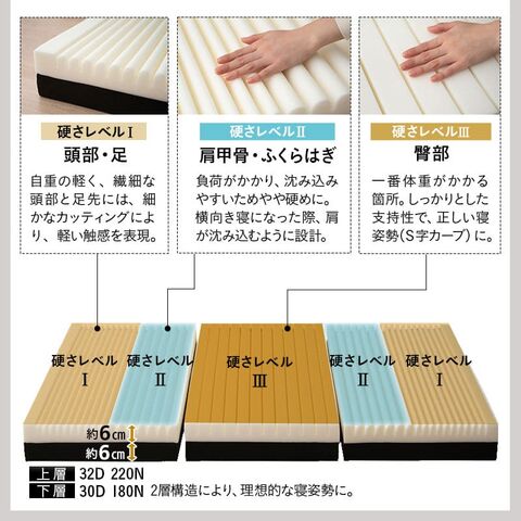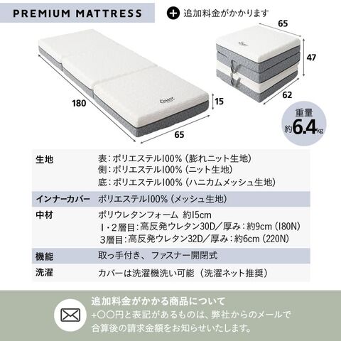 ■サイズ 約幅65×奥行180×厚さ15cm (折りたたみ時:約幅65×奥行62×高さ47cm) ■素材 カバー(表面):ポリエステル100%(膨れニット生地) カバー(側面):ポリエステル100%(ニット生地) カバー(底面):ポリエステル100%(ハニカムメッシュ生地) 中袋:ポリエステル100%(メッシュ生地) 中材(1・2層目):高反発ウレタンフォーム 30D/180N 中材(3層目):高反発ウレタンフォーム 32D/220N ■商品重量 約6.4kg ■お手入れ方法 カバーを取り外して洗濯機洗い可能 ※洗濯ネット使用推奨 |