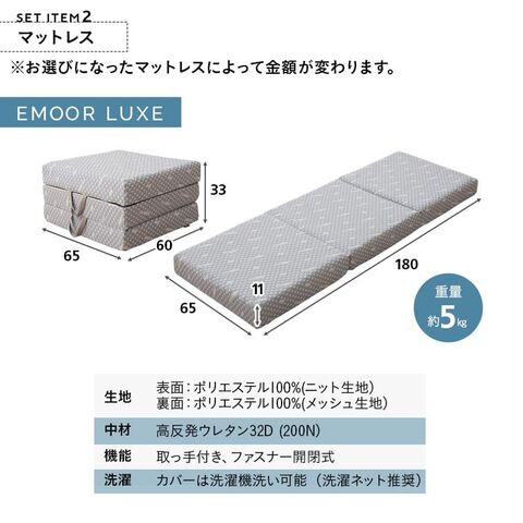 ■サイズ 約幅65×奥行180×厚さ11cm (折りたたみ時:約幅65×奥行60×高さ33cm) ■素材 表生地:ポリエステル100%(ニット生地) 裏生地:ポリエステル100%(メッシュ生地) 中材:高反発ウレタンフォーム 32D/200N ■商品重量 約5kg ■お手入れ方法 カバーを取り外して洗濯機洗い可能 ※洗濯ネット使用推奨 |