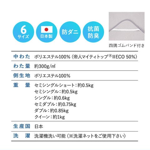 | サイズ | セミシングルショート:約幅80×奥行180cm (約0.5kg) セミシングル:約幅80×奥行195cm (約0.5kg) シングル:約幅97×奥行195cm (約0.6kg) セミダブル:約幅120×奥行195cm (約0.75kg) ダブル:約幅140×奥行195cm (約0.85kg) クイーン:約幅160×奥行195cm (約1kg) |