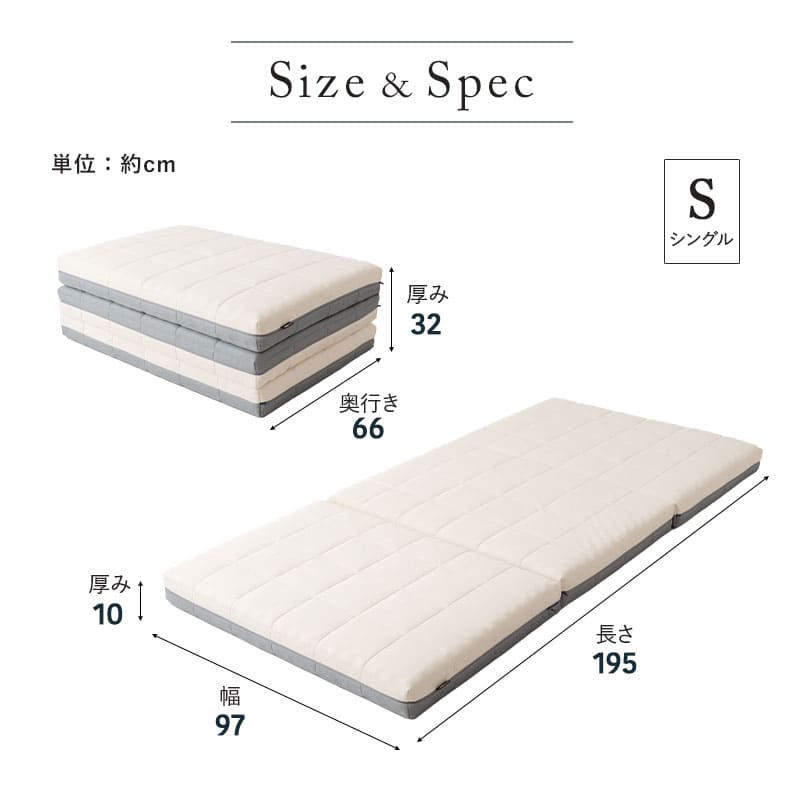 | サイズ | シングルサイズ:約幅97×奥行195×厚さ10cm (折りたたみ時:約幅97×奥行66×高さ32cm) |