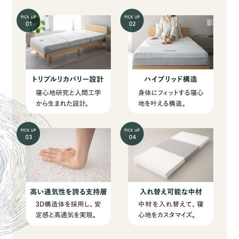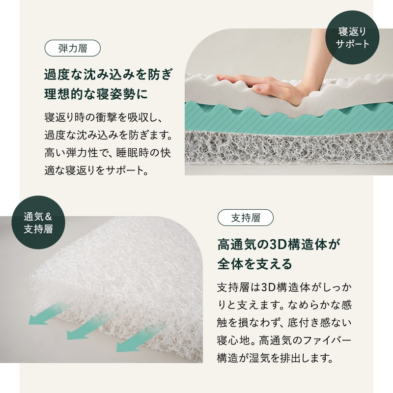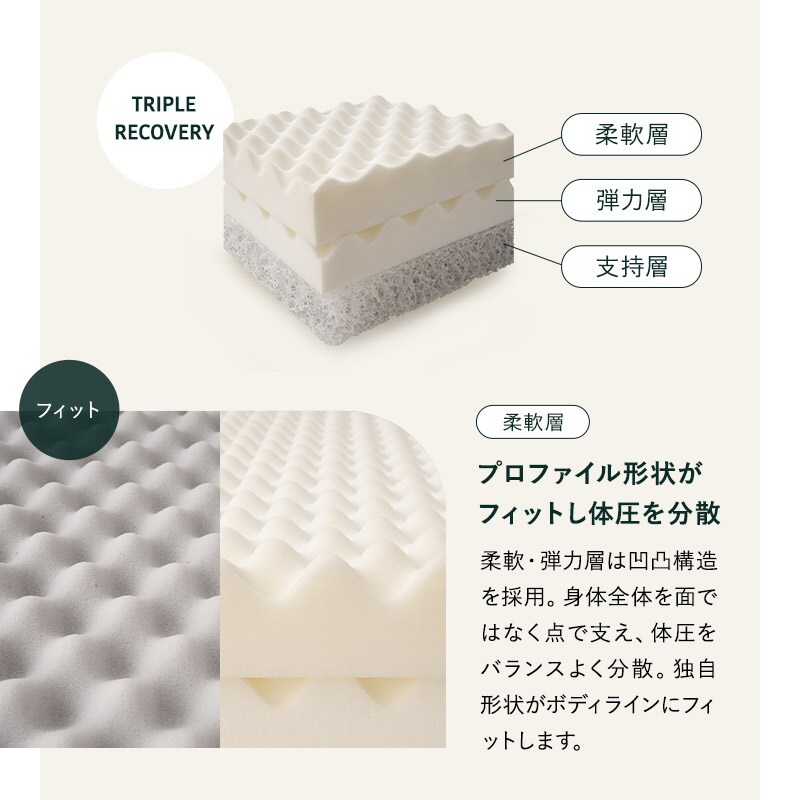 | 素材 | ■カバー 表面/側面(ホワイト):ポリエステル100%(3層ニット生地) 側面/裏面(グレー):ポリエステル100%(ニット生地) ■中袋 1・2層目:ポリエステル100%(メッシュ生地) 3層目:ポリエステル100% ■中材 <頭/脚部> 1・2層目:高弾性ウレタン 35D/150N 3層目:3D構造体(ポリエチレン) 60D <腰部> 1・2層目:高反発ウレタン 35D/260N 3層目:3D構造体(ポリエチレン) 65D |