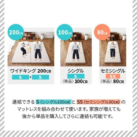 | サイズ | ワインドキング200cm:約幅200×長さ195×厚さ10cm ※シングル(約幅100×長さ195×厚さ10cm)×2枚 |