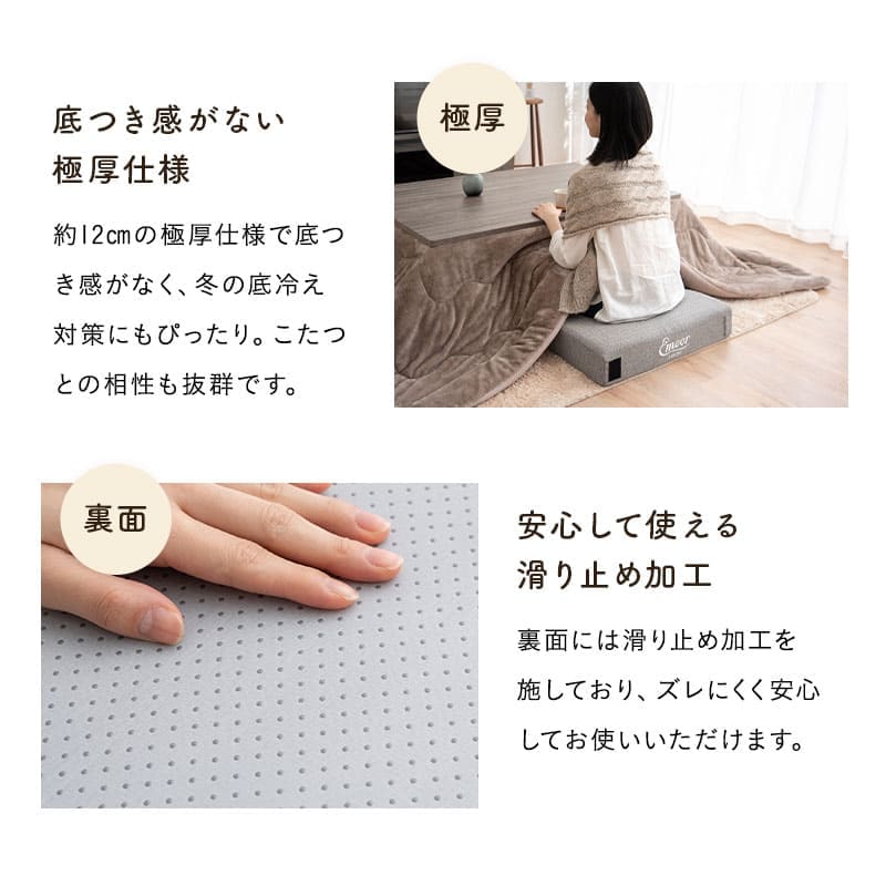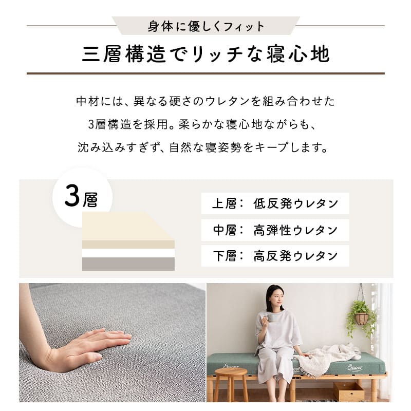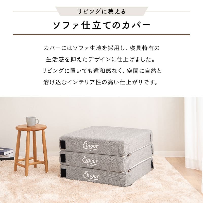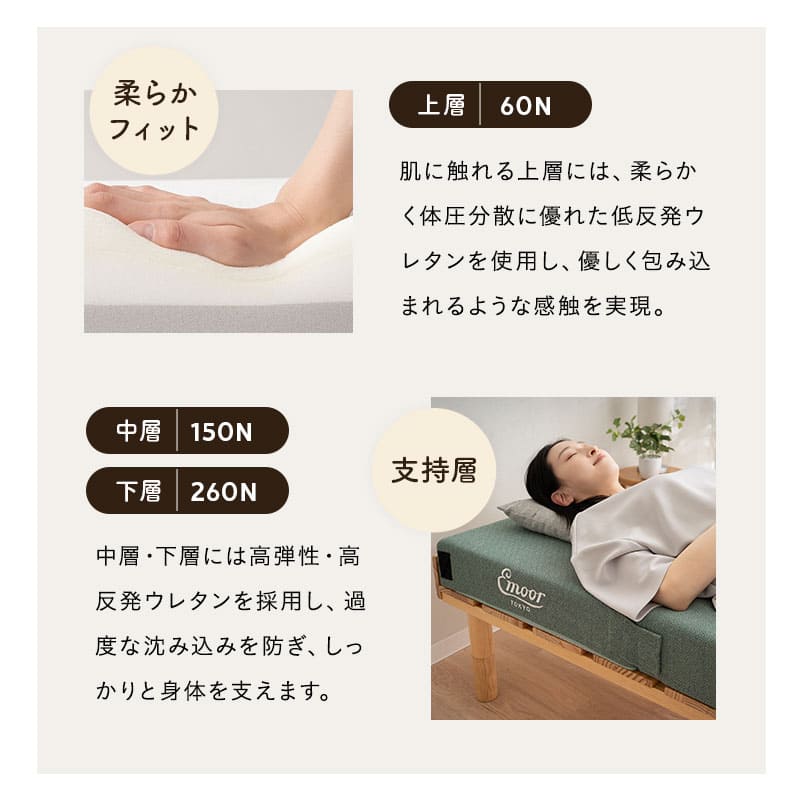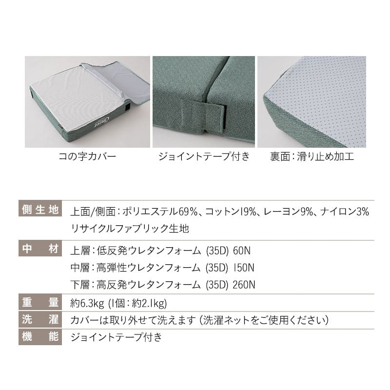 | 素材 | ■側生地 表面/側面:ポリエステル69%、コットン19%、レーヨン9%、ナイロン3% (リサイクルファブリック生地) 裏面:ポリエステル100% ■インナーカバー ポリエステル100%(メッシュ生地) ■中材 上層:高反発ウレタンフォーム 35D/60N 中層:高反発ウレタンフォーム 35D/150N 下層:高反発ウレタンフォーム 35D/260N |