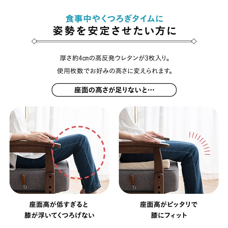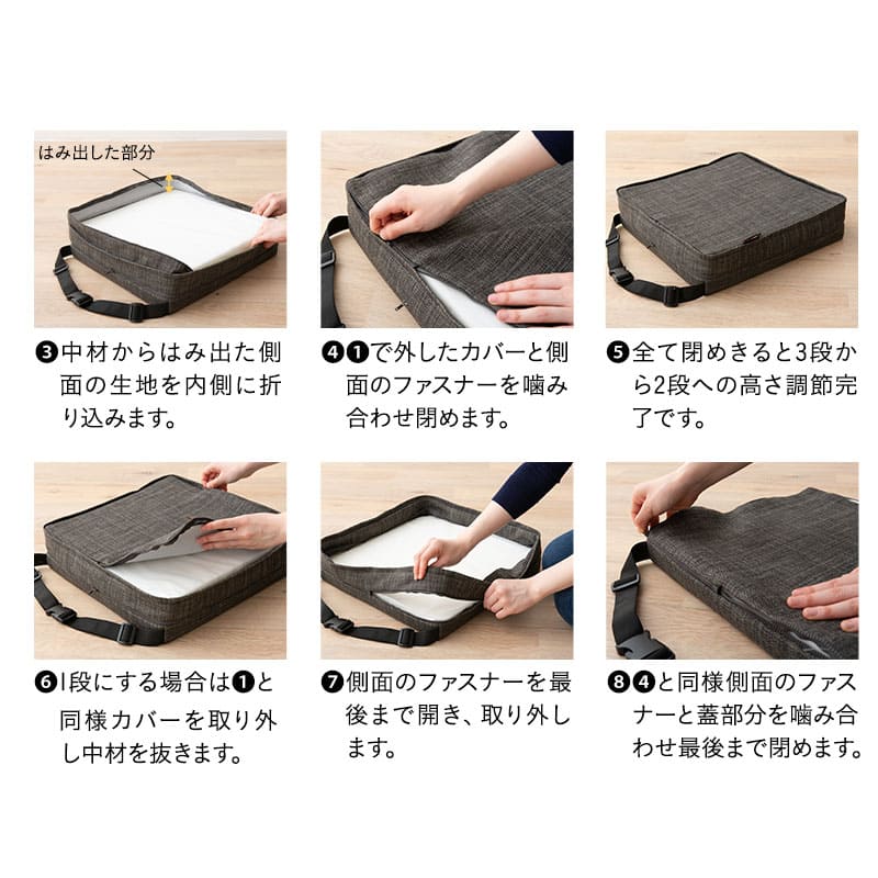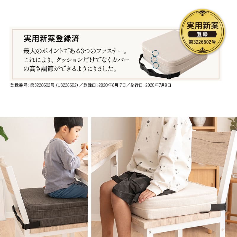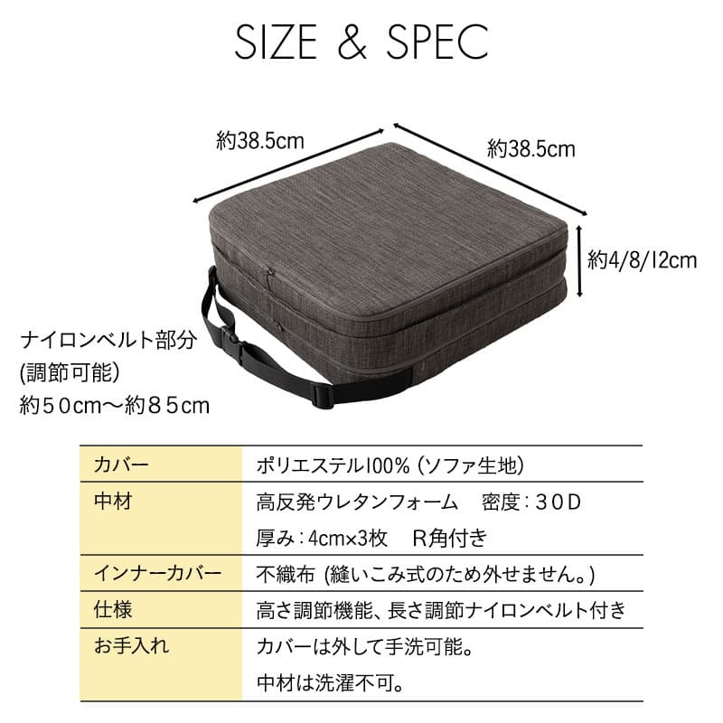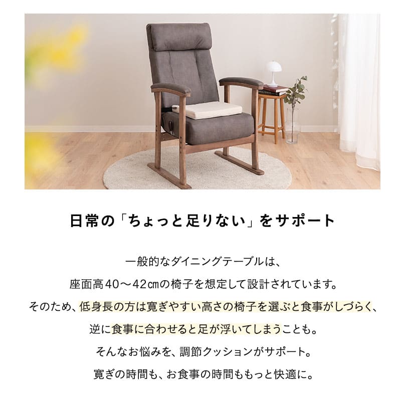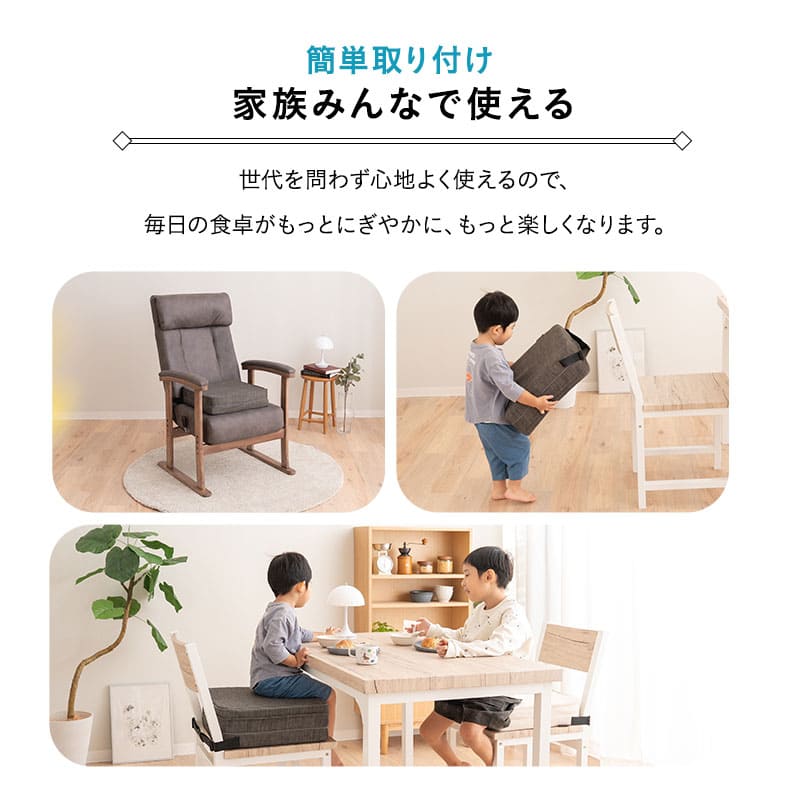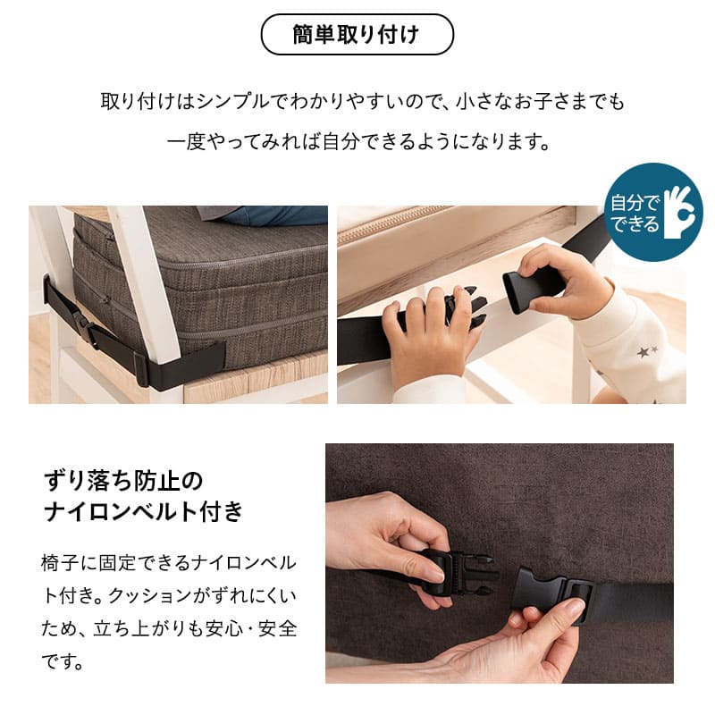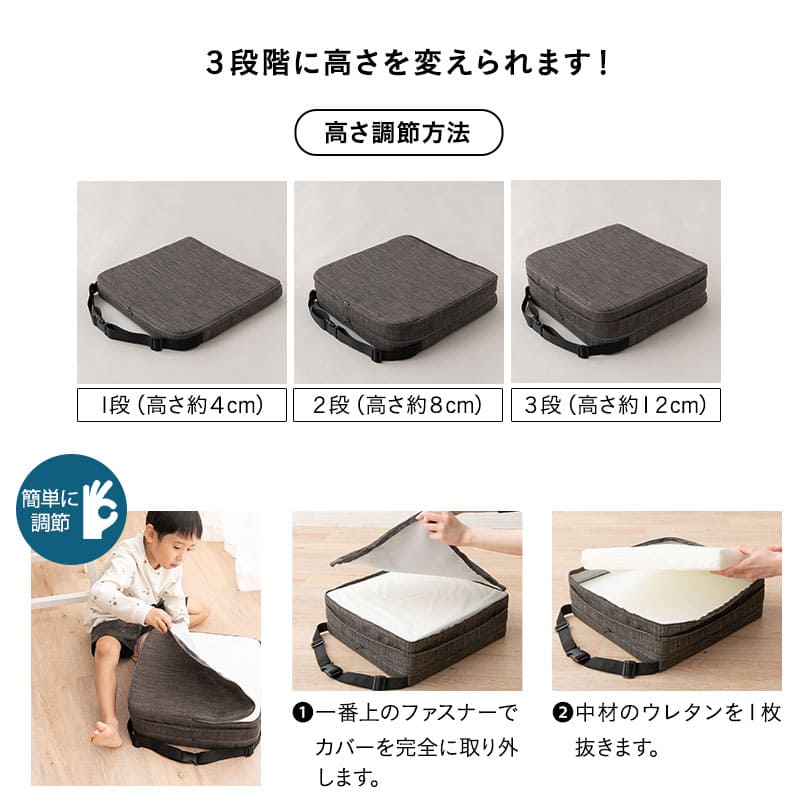 座面高調節クッション チェアクッション リュッケ 3段 ノーマルタイプ ソファ生地 正方形 高さ調節可能 ベルト付き お食事クッション 座布団 クッション オフィス 在宅 椅子 チェア 高座椅子 ダイニングチェア 大人 子供 キッズ リビング ダイニン