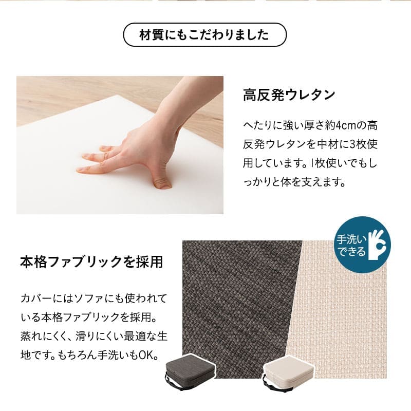 | 素材 | カバー:ポリエステル100%(ソファ生地) 中材:高反発ウレタン 30D (厚さ約4cm×3枚) インナーカバー:不織布 ※縫い込み式のため外せません。 |