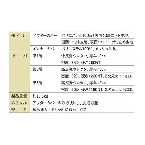 | 素材 | ■カバー 表面:ポリエステル100%(3層ニット生地) 側面:ポリエステル100%(ニット生地) 底面:ポリエステル100%(メッシュ滑り止め生地) ■中袋 ポリエステル100%(メッシュ生地) ※縫い込み式 ■中材 1層目:低反発ウレタン 35D/60NT 約3cm 2層目:高反発ウレタン 32D/220NT 約8cm 3層目:高反発ウレタン 30D/190NT 約9cm |