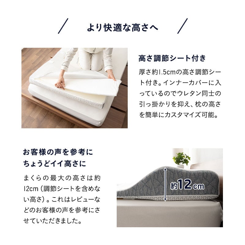 | 組成 | ■カバー 表面:ポリエステル99%、ポリウレタン1%(膨れニット生地) 側面:ポリエステル99%、ポリウレタン1%(ニット生地) 裏面:ポリエステル100%(メッシュ生地) ■中袋 ポリエステル100%(メッシュ生地) ■中材 上層:無膜ウレタン 28D (厚さ約0.5cm) 中層:低反発ウレタン 35D/60N 高さ調節シート:高反発ウレタン 30D (厚さ約1.5cm×1枚) |