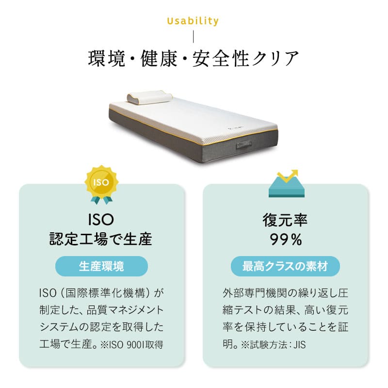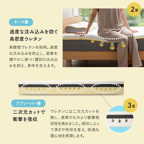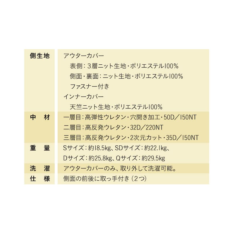 | 素材 | ■カバー 表面:ポリエステル100%(3層ニット生地) 側面/裏面:ポリエステル100%(ニット生地) ■インナーカバー ポリエステル100%(天竺ニット生地) ■中材 1層目:高弾性ウレタン 50D/150NT (穴開き加工) 2層目:高反発ウレタン 32D/220NT 3層目:高反発ウレタン 35D/150NT (2次元カット) |