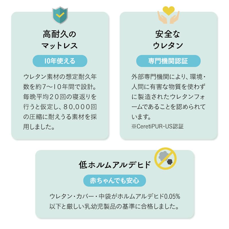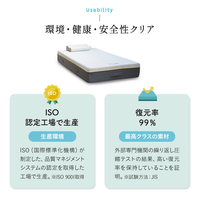 | 素材 | ■カバー 表面:ポリエステル100%(3層ニット生地) 側面/裏面:ポリエステル100%(ニット生地) ■インナーカバー ポリエステル100%(天竺ニット生地) ■中材 1層目:低反発ウレタン 38D/60NT (穴開き加工) 2層目:高反発ウレタン 35D/260NT 3層目:高反発ウレタン 35D/150NT (2次元カット) 4層目:高反発ウレタン 32D/220NT (穴開き加工) |