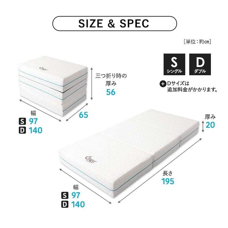 | サイズ | <シングルサイズ> 全体:約幅97×奥行195×厚さ20cm (折りたたみ時:約幅97×奥行65×厚さ56cm) <ダブルサイズ> 全体:約幅140×奥行195×厚さ20cm (折りたたみ時:約幅140×奥行65×厚さ56cm) |