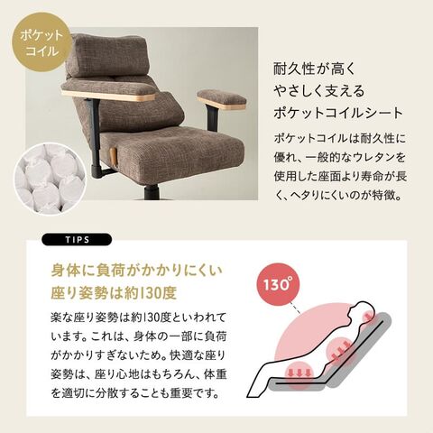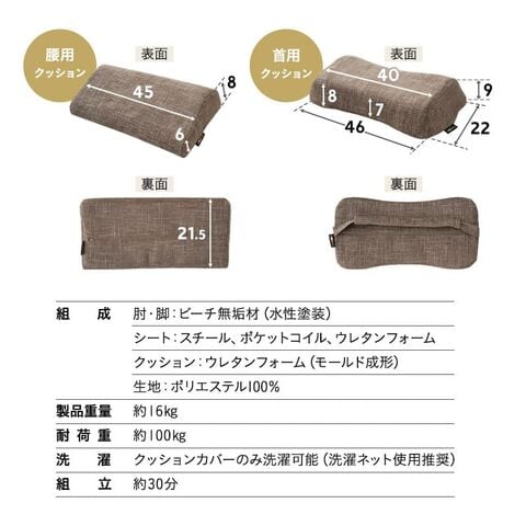 | サイズ | 全体:約幅69.5×奥行63-135×高さ79-99.5cm 座面:約幅45.5×奥行48×高さ41-47cm 背もたれ:約幅45×長さ63cm 首用クッション:約幅46×奥行22×厚さ9cm 腰用クッション:約幅45×奥行21.5×厚さ(最大)8cm ※計測する位置や角度により、若干の誤差が生じる場合があります。 |