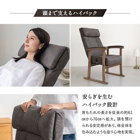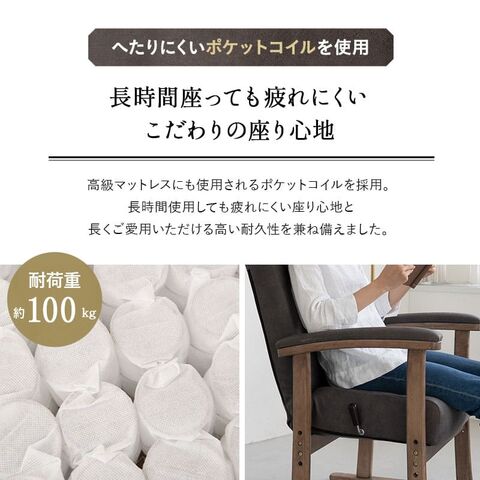 | 高座椅子 | ■サイズ 全体:約幅64×奥行62-104×高さ88-116cm 座面:約幅50×奥行45cm 座面高:42/45/48cm 肘の高さ:約66cm 背もたれ:約幅50×長さ70cm ※計測する位置や角度により、若干の誤差が生じる場合があります。 ■素材 フレーム:スチール 中材:ポケットコイルシート 張地:ポリエステル100%(ファブレザー) 肘:天然木(ポプラ) ■製品重量 約12.2kg ■耐荷重 約100kg ■仕様 座面3段階高さ調節 ヘッドレスト14段階角度調節 背面レバー式無段階リクライニング |