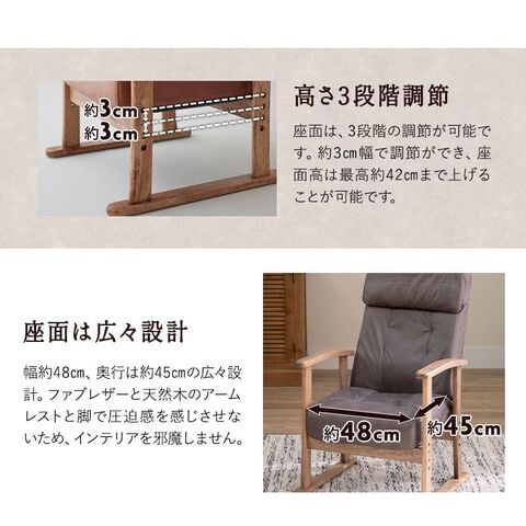 | 高座椅子 | ■サイズ 全体:約幅60×奥行58-95×高さ94-100cm 座面:約幅48×奥行45cm 座面高:36/39/42cm 肘の高さ:約56cm 背もたれ:約幅49×長さ61cm ※計測する位置や角度により、若干の誤差が生じる場合があります。 ■素材 フレーム:スチール 中材:ポケットコイル、ウレタンフォーム 張地:ポリエステル100%(ファブレザー) 肘:天然木(ポプラ) ■製品重量 約11kg ■耐荷重 約100kg ■仕様 座面3段階高さ調節 ヘッドレスト14段階角度調節 背面レバー式無段階リクライニング |
