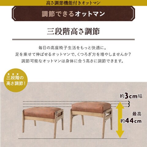 | オットマン | ■サイズ 全体:約幅54×奥行40cm 高さ:約38/41/44cm ■素材 座板:積層合板 中材:ウレタンフォーム 張地:ポリエステル100% 脚部:天然木(ポプラ) ■製品重量 約4kg ■耐荷重 約90kg ■仕様 3段階高さ調節 |