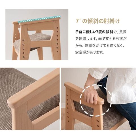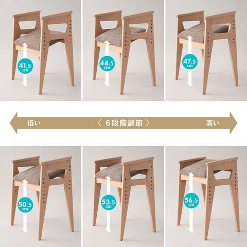 | サイズ | 全体:約幅54×奥行39×高さ69cm 座面:約幅47×奥行32×高さ41.5-56.5cm 座面の勾配:約18度 肘の高さ:約65cm ※計測する位置や角度により、若干の誤差が生じる場合があります。 |