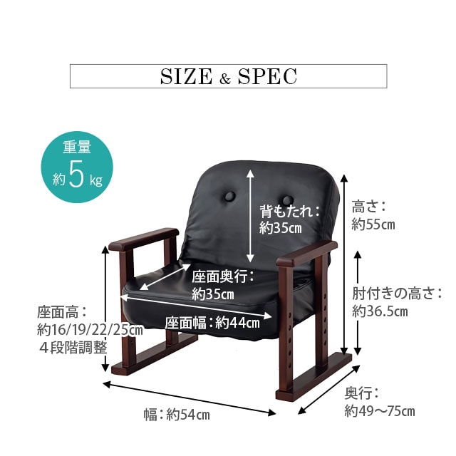 | サイズ | 約幅54×奥行49-75×高さ55×座面高16/19/22/25cm(4段階調節) 座面幅:約44cm 座面奥行:約36cm 背もたれ:約35cm 肘の高さ:約36.5cm |