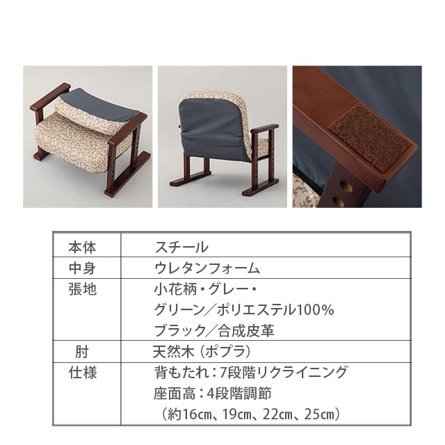 | 材質 | 本体:スチール 中身:ウレタンフォーム 張地:小花柄/グレー/グリーン(ポリエステル100%)、ブラック(合成皮革) 肘:天然木(ポプラ) |