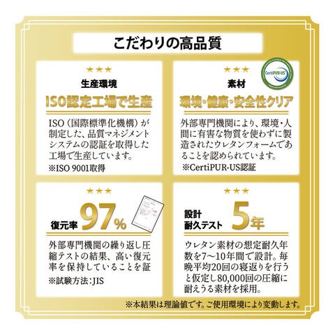 | 素材 | 側生地:ポリエステル100%(ニットジャガード生地) 中材:高反発ウレタンフォーム(密度30D、180N) |