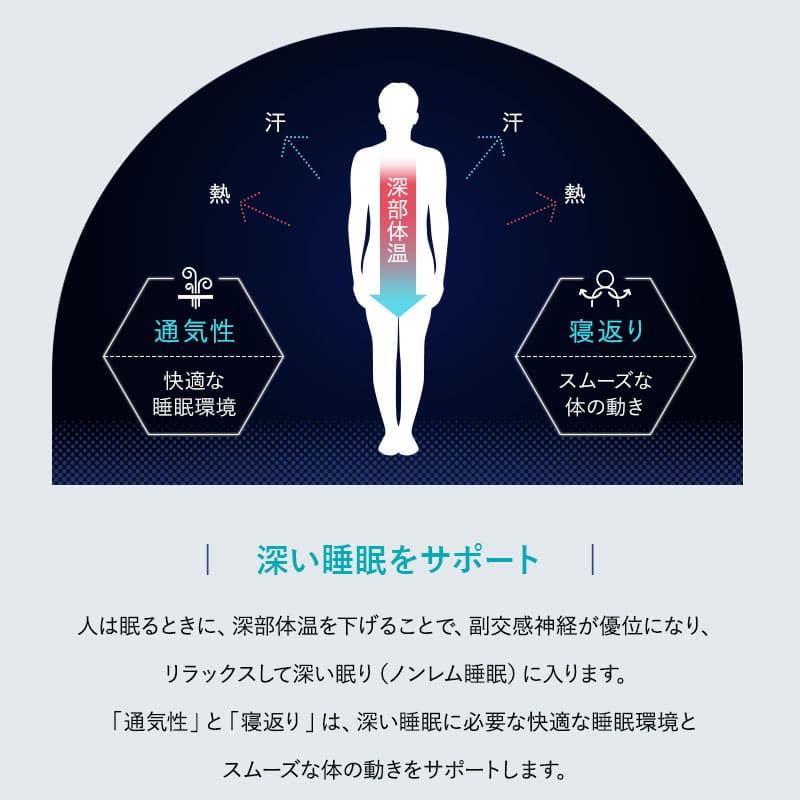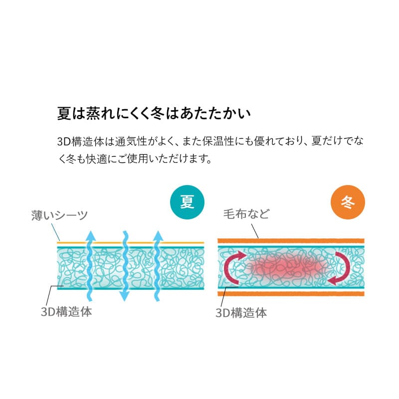 | 素材 | ■カバー 表生地/側面:ポリエステル100%(ニット生地) 中材:樹脂わた 底面:ポリエステル100%(メッシュ生地) ■中袋 ポリエステル100% ■中材 3D構造体(ポリエチレン) 頭/脚部:60D 約4cm 腰部:65D 約4cm |