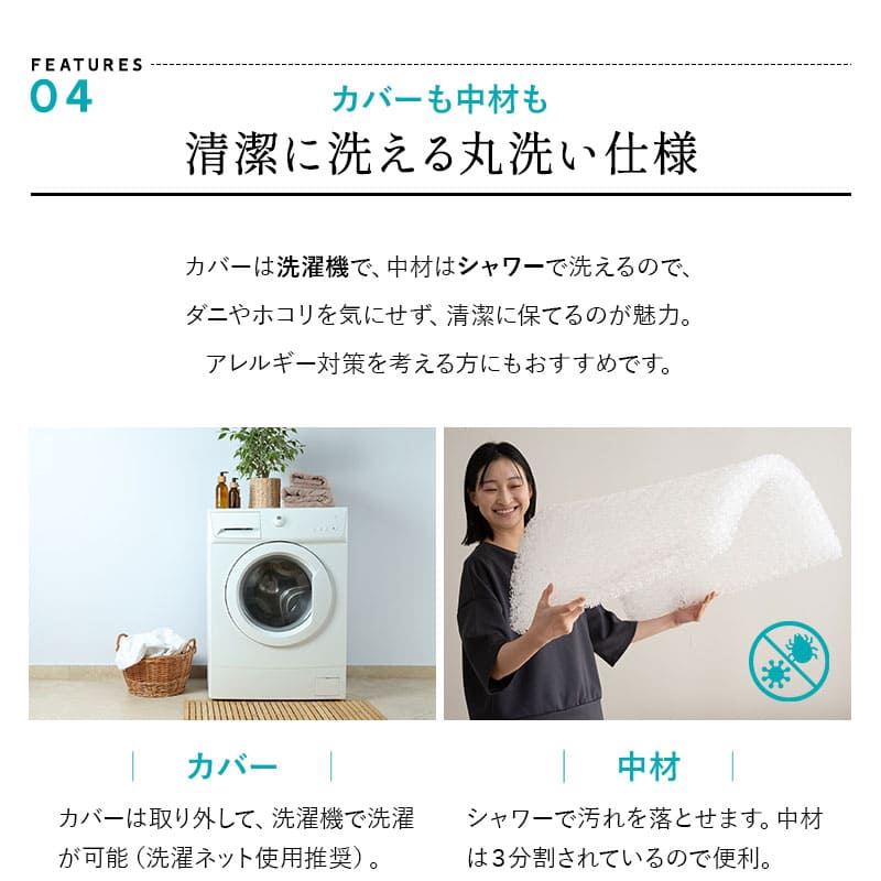| お手入れ方法 | カバー:取り外して洗濯機洗い可能(洗濯ネット使用推奨) 中材:シャワーなどで丸洗い可能(洗濯機不可) ※中材は水気を切って風通しの良い場所で陰干ししてください。 |
