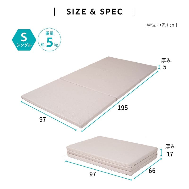 | サイズ | シングルサイズ:約幅97×奥行195×厚さ5cm (折りたたみ時:約幅97×奥行66×厚さ17cm) |