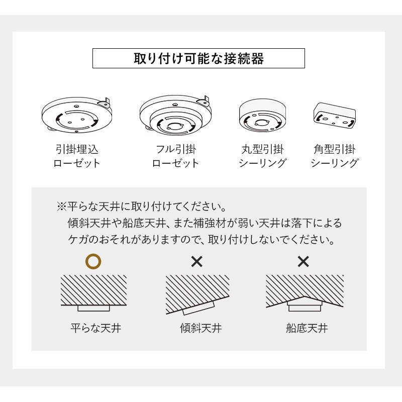 | 注意事項 | ※平らな天井に取り付けてください。 ※商品に付属する説明書をご確認の上、安全に注意して取り付けを行ってください。 ※お手入れをする際は必ず電源を切ってから行ってください。 ※LEDはお客様ご自身で交換することはできません。寿命や故障により点灯しなくなった際は、ご使用を中止していただき、修理のご依頼をお願いします。 |