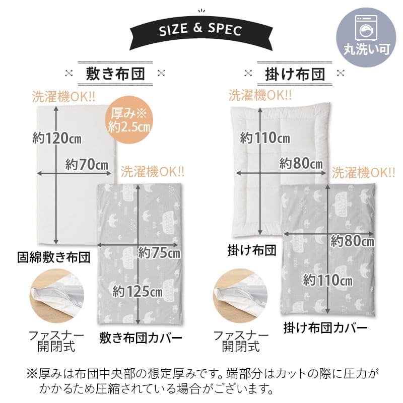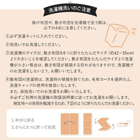 | 洗濯方法 | 洗濯機洗い可能 ※お洗濯の際は、以下の4点に注意してください。 ・必ず洗濯ネットに入れてください。 ・弱洗いでお洗濯してください。 ・洗濯槽のサイズが、敷き布団を6つに折りたたんだサイズ(約42×35cm)より大きいことを確認してください。敷き布団をたたんだサイズより洗濯槽が小さい場合は、敷き布団が破損する恐れがありますので、洗濯機でのお洗濯をしないよう、お願いいたします。 ・敷布団の洗濯時は、破損を防ぐため、毛布コースを選択の上、洗濯キャップの使用を推奨いたします。また、側生地保護のため、6分の1の大きさまで折りたたみ、単独洗いでのお洗濯をお願いいたします。(※必ずご利用の洗濯機の取扱説明書に従ってお洗濯をお願いします。) |