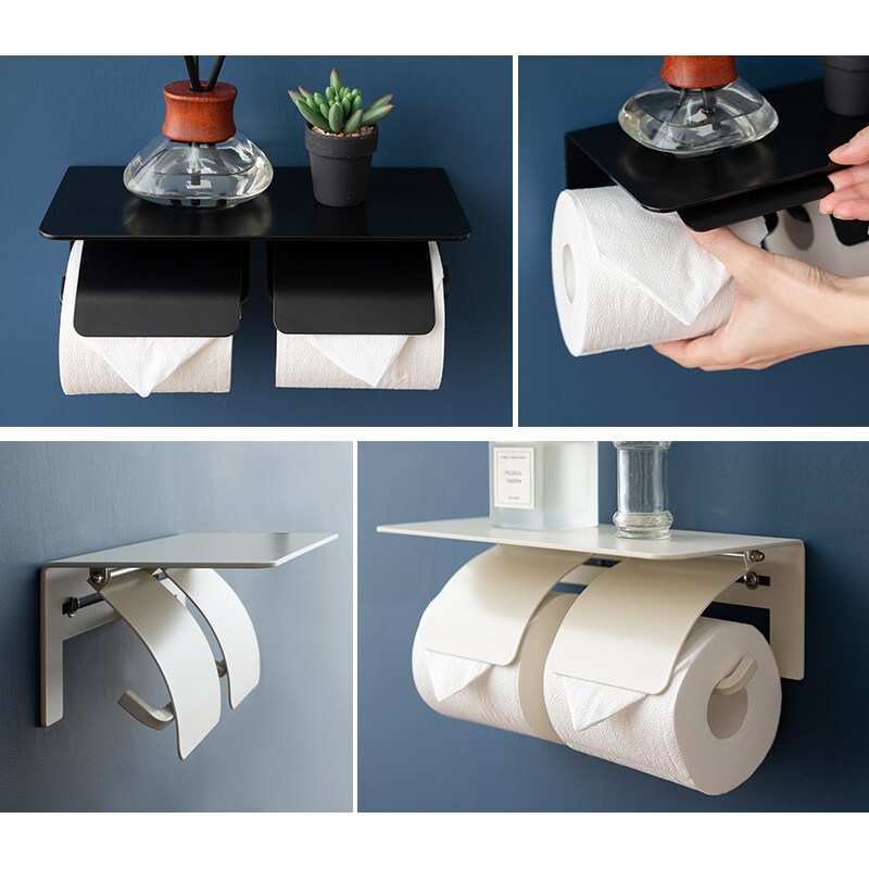 トイレットペーパーホルダー 2個用 2連 二連 ダブル 3倍巻き 棚付き スチール おしゃれ トイレ 手洗 収納 トイレ収納 トイレットペーパー 北欧 トイレラック スリム ペーパーホルダー ストッカー ラック ホルダー ブラック ホワイト 黒 白 紙巻器 送料無料 エムール