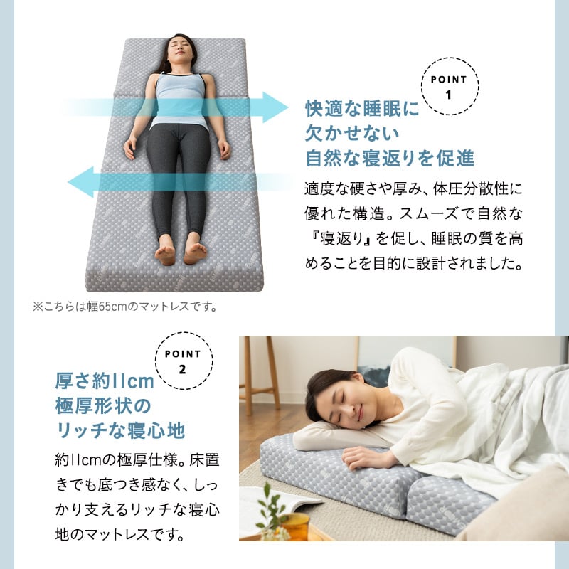 ■サイズ セミシングルショート:約幅80×奥行180×厚さ11cm (折りたたみ時:約幅80×奥行60×高さ33cm) ■組成 表生地:ポリエステル100%(ニット生地) 裏生地:ポリエステル100%(メッシュ生地) 中材:高反発ウレタンフォーム 32D/200N ■製品重量 約5.7kg ■お手入れ方法 カバーを取り外して洗濯機洗い可能 ※洗濯ネット使用推奨 |
