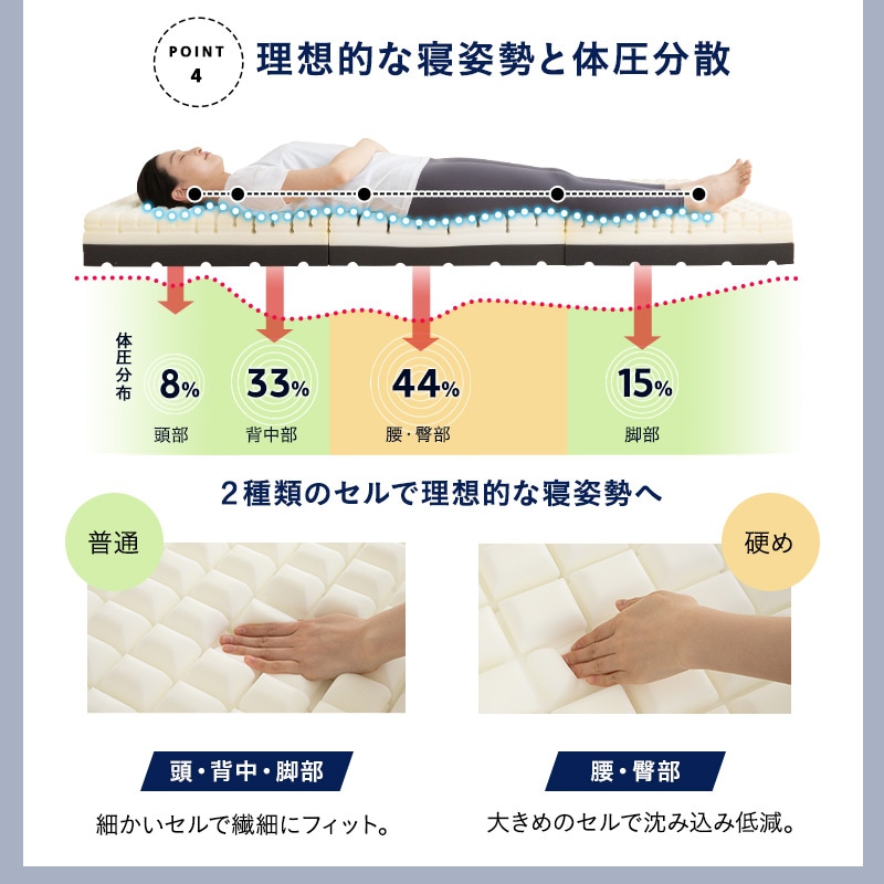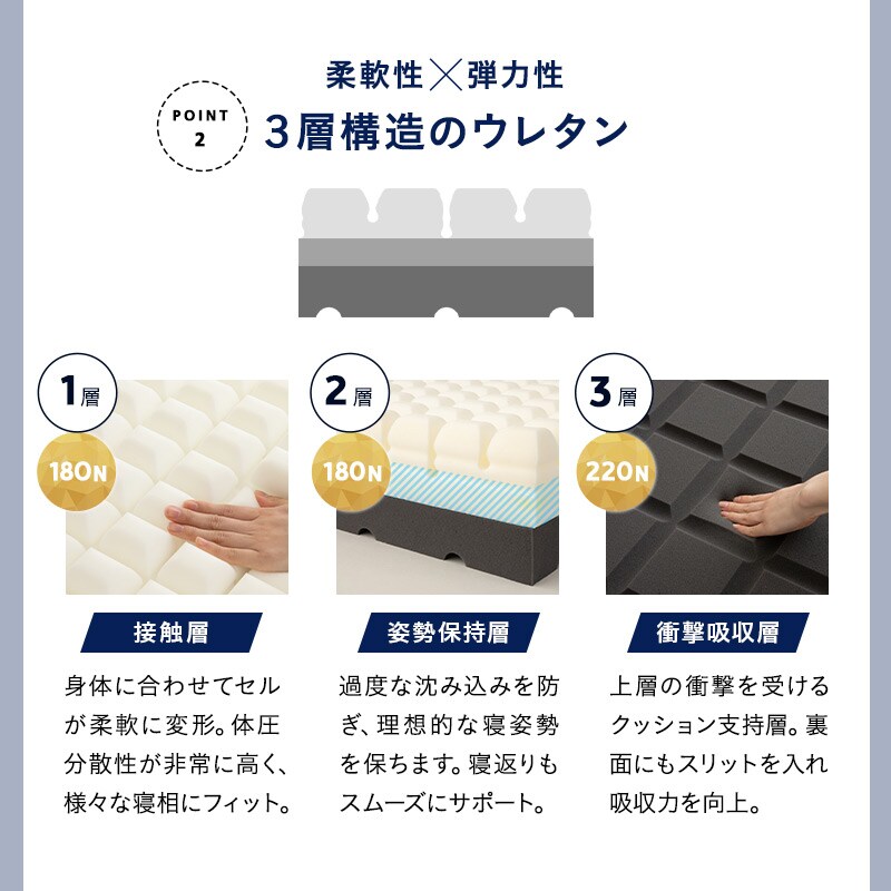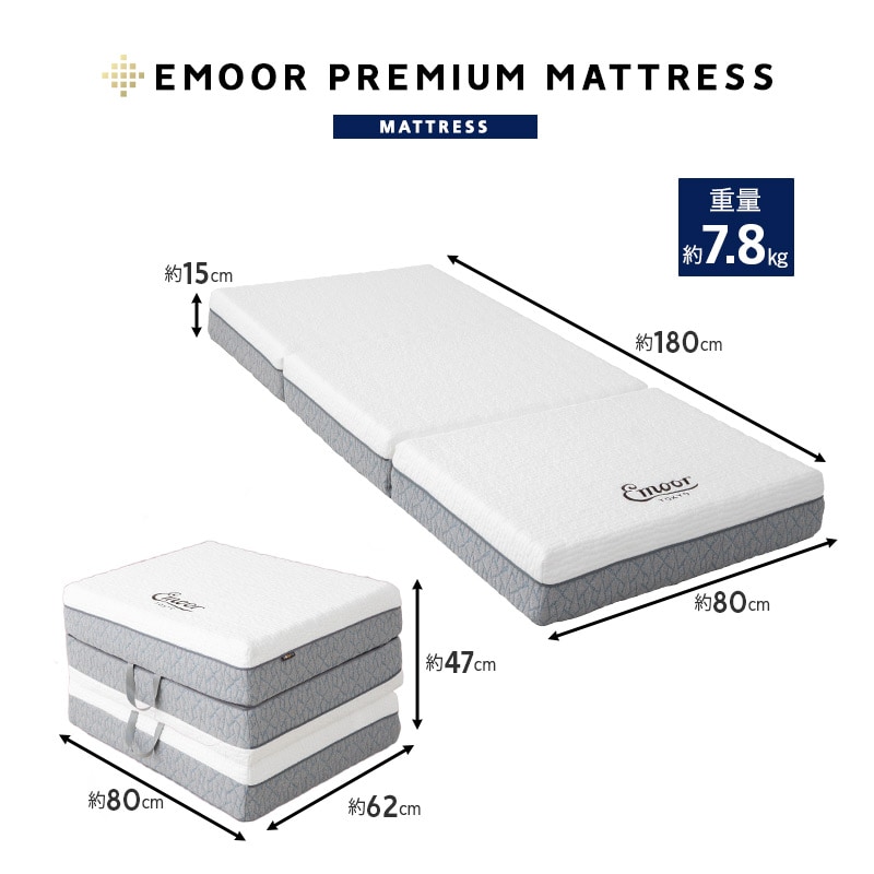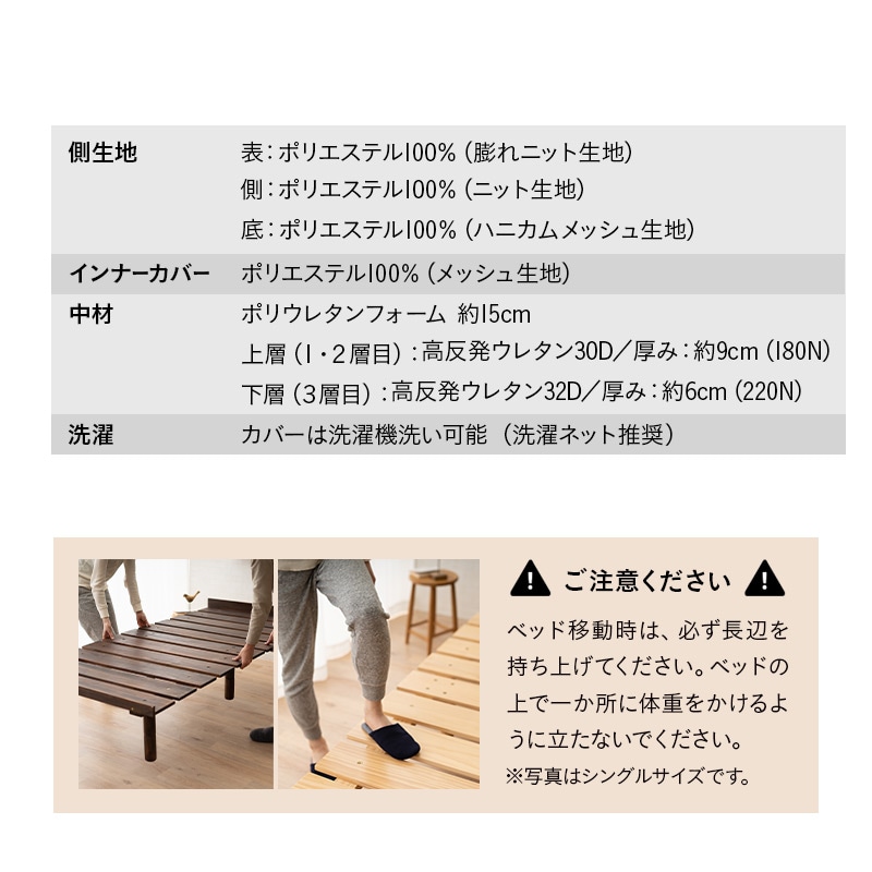 ■サイズ セミシングルショート:約幅80×奥行180×厚さ15cm (折りたたみ時:約幅80×奥行62×高さ47cm) ■組成 側生地(表面):ポリエステル100%(膨れニット生地) 側生地(側面):ポリエステル100%(ニット生地) 側生地(底面):ポリエステル100%(ハニカムメッシュ生地) インナーカバー:ポリエステル100%(メッシュ生地) 中材(1・2層目):高反発ウレタンフォーム 30D/180N 中材(3層目):高反発ウレタンフォーム 32D/220N ■製品重量 約7.8kg ■お手入れ方法 カバーを取り外して洗濯機洗い可能 ※洗濯ネット使用推奨 |