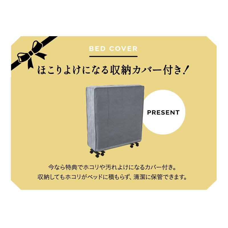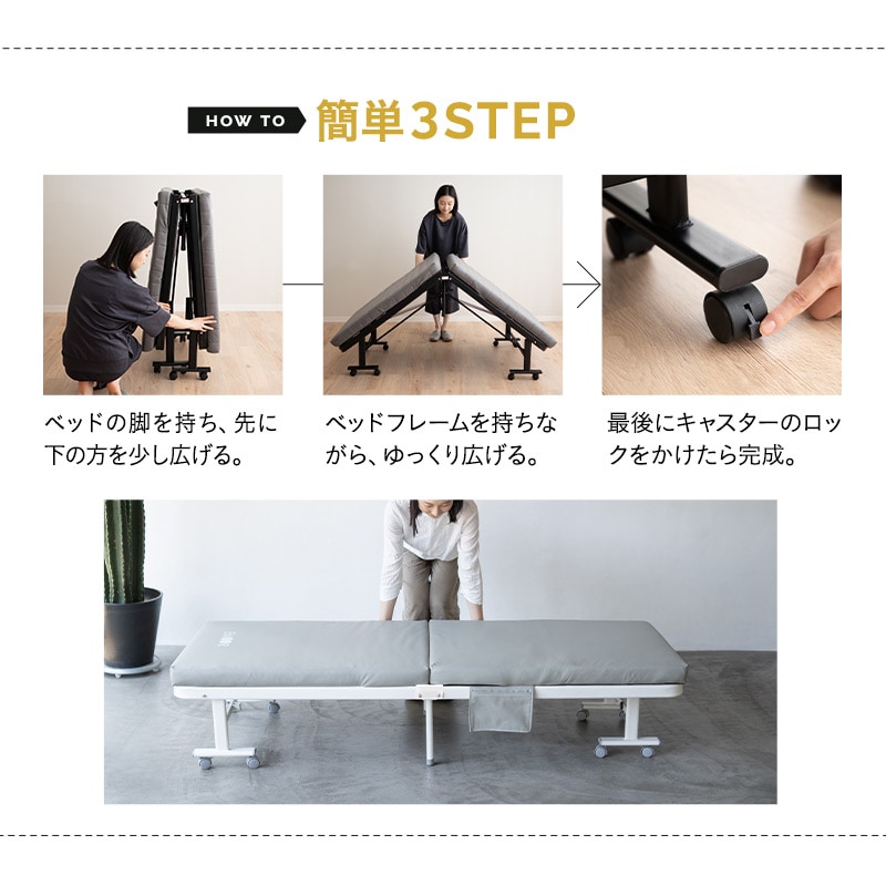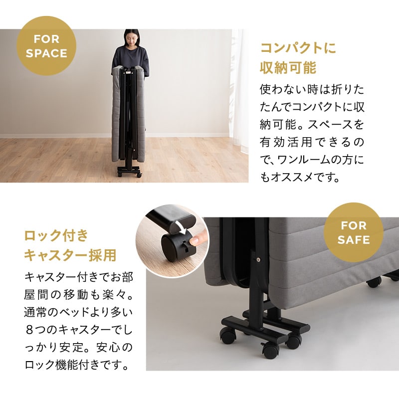 | サイズ | シングルサイズ ノーマルタイプ:約幅90×奥行190×高さ28cm (折りたたみ時:約幅90×奥行32×高さ104cm) ハイタイプ:約幅90×奥行190×高さ40cm (折りたたみ時:約幅90×奥行32×高さ111cm) マットレスの厚さ:約8cm |